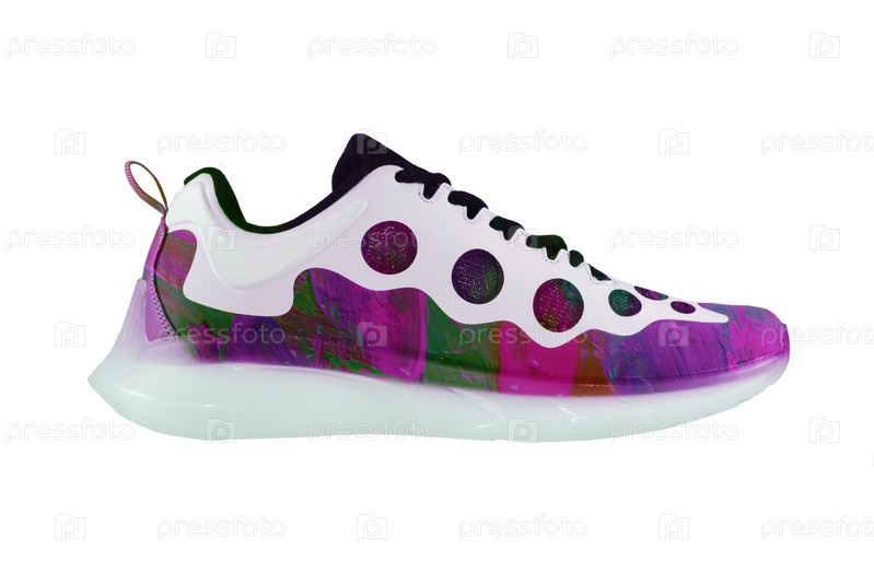 Разноцветные креативные кроссовки на белом фоне. Яркие радостные туфли