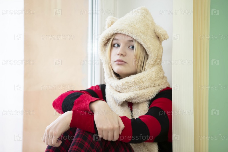 Девочка-подросток в смешной меховой шапке сидит на подоконнике и смотрит в камеру