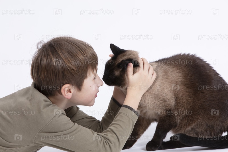 Маленький мальчик играет с кошкой. Ребенок и домашнее животное