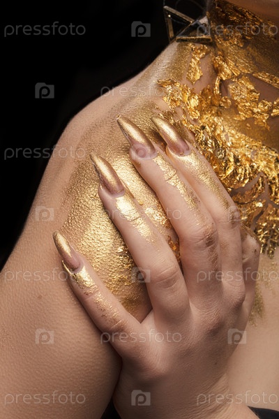 На плече пальцы с золотым маникюром на черном фоне