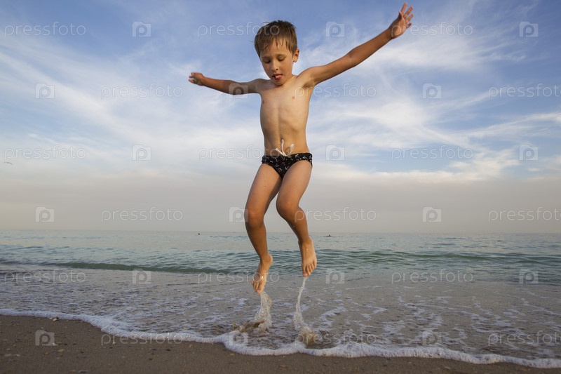 Ребенок выпрыгивает из воды. Мальчик прыгает в океан. Отдых на море