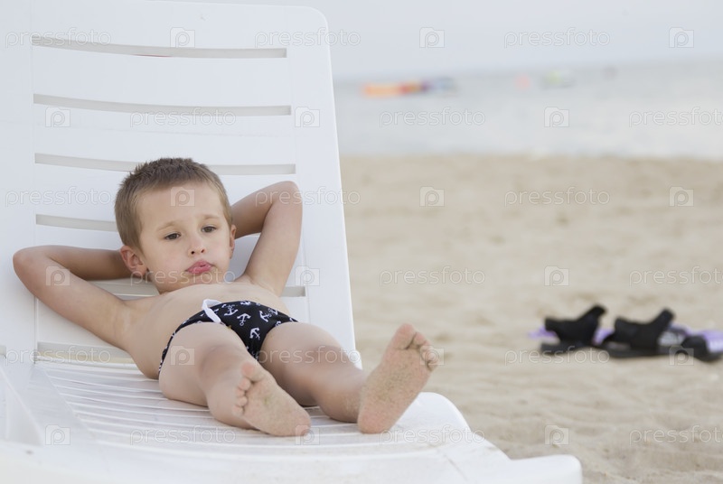 Ребенок в шезлонге у моря. Маленький мальчик отдыхает на море