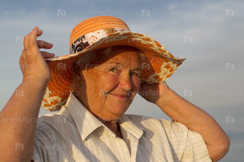 Красивая пожилая женщина в шляпе на фоне моря. Лицо пожилой женщины с улыбкой