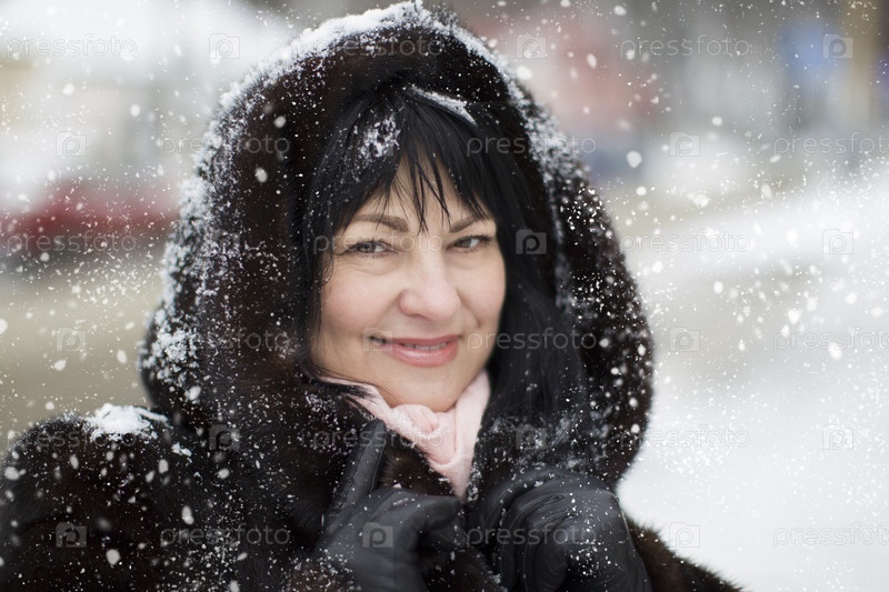 Пожилая женщина в меховом капюшоне, покрытом снегом
