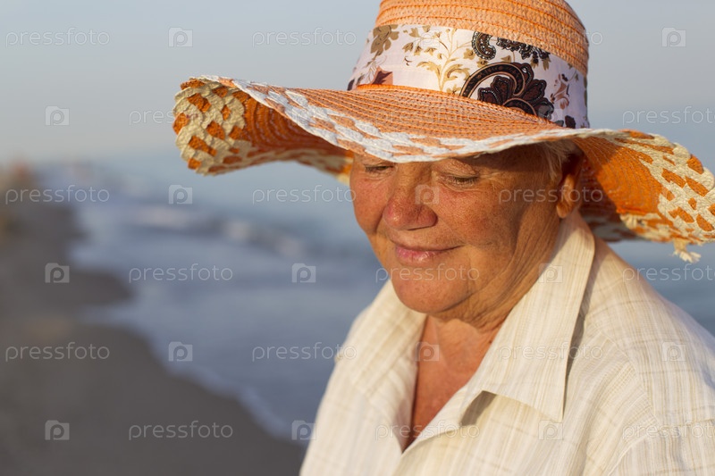 Красивая пожилая женщина в шляпе на фоне моря. Лицо пожилой женщины с улыбкой. Бабушка в отпуске