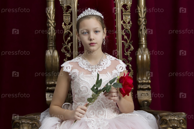 Девушка-подросток умна в красном роскошном королевском кресле. Девушка принцесса. Королева в красном кресле. Роскошная юная леди с алой розой в белом платье в старом красном кресле