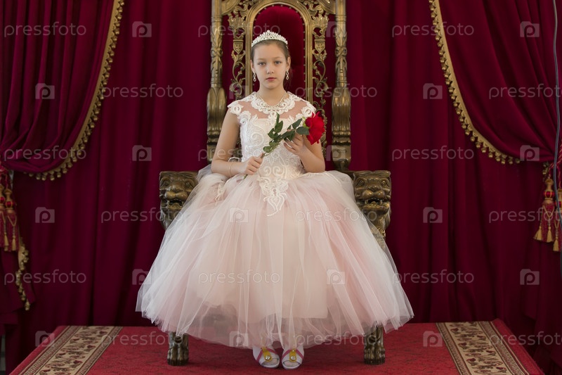 Девушка-подросток умна в красном роскошном королевском кресле. Девушка принцесса. Королева в красном кресле. Роскошная юная леди с алой розой в белом платье в старом красном кресле