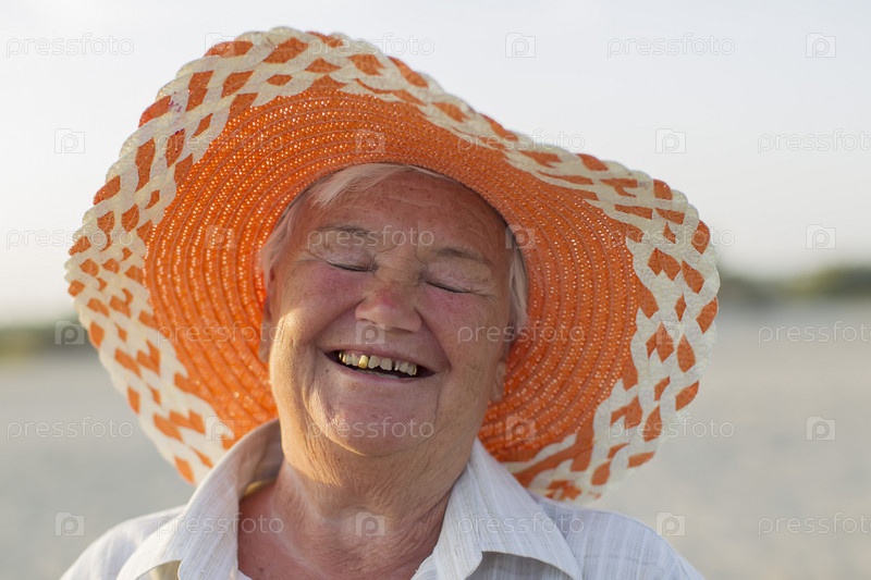 Лицо старухи. Бабушка в отпуске. Веселая старушка в шляпе счастливо смеется. Улыбайтесь искусственными зубами