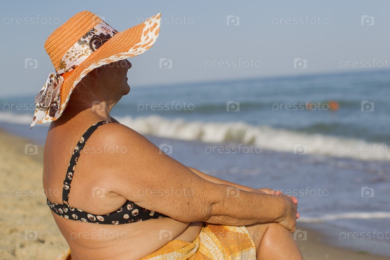 Бабушка в отпуске. Пожилая женщина в купальнике у моря. Старик сидит на берегу