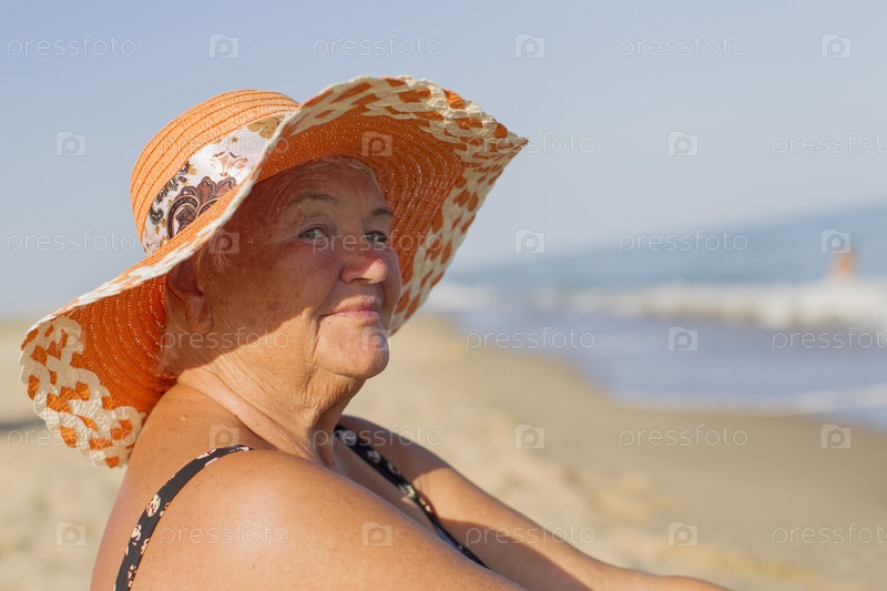 Бабушка в отпуске. Пожилая женщина в купальнике у моря. Старик сидит на берегу