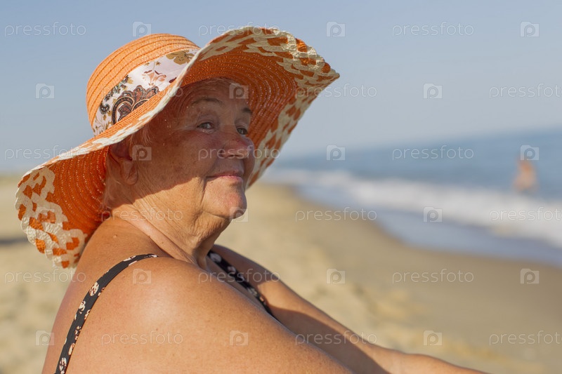 Бабушка в отпуске. Пожилая женщина в купальнике у моря. Старик сидит на берегу