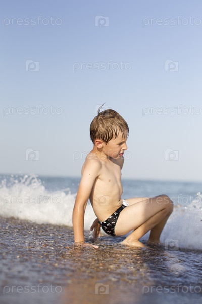Мальчик сидит на пляже и играет с волной. Ребенок в отпуске на пляже