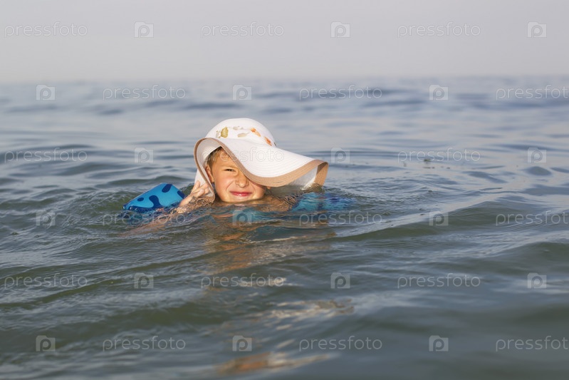 Ребенок в Панаме плавает в воде. Мальчик в широкополой шляпе в океане