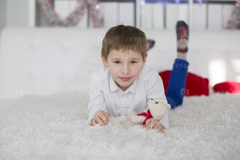 Мальчик-дошкольник лежит на кровати с игрушкой. Мальчик школьник отдыхает. Красивый ребенок в белой рубашке на белой кровати с мягким плюшевым мишкой