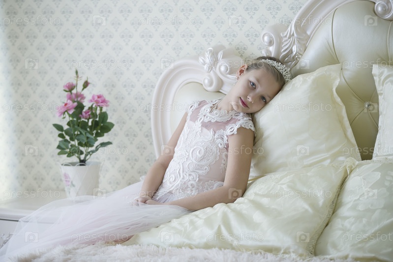 Симпатичная нежная девочка-подросток лежит на кровати. Принцесса в белом платье с короной