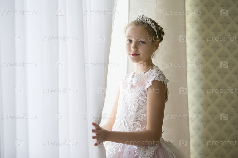 Красивая девушка в короне у окна открыла занавеску