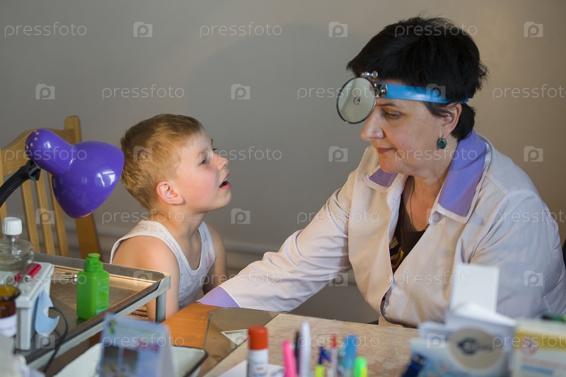 Беларусь, город Добруш, 12 июля 2018 года. Детская центральная больница. Детский отоларинголог осматривает пациента. Врач лечит больное горло у ребенка. Мальчик на приеме в больнице