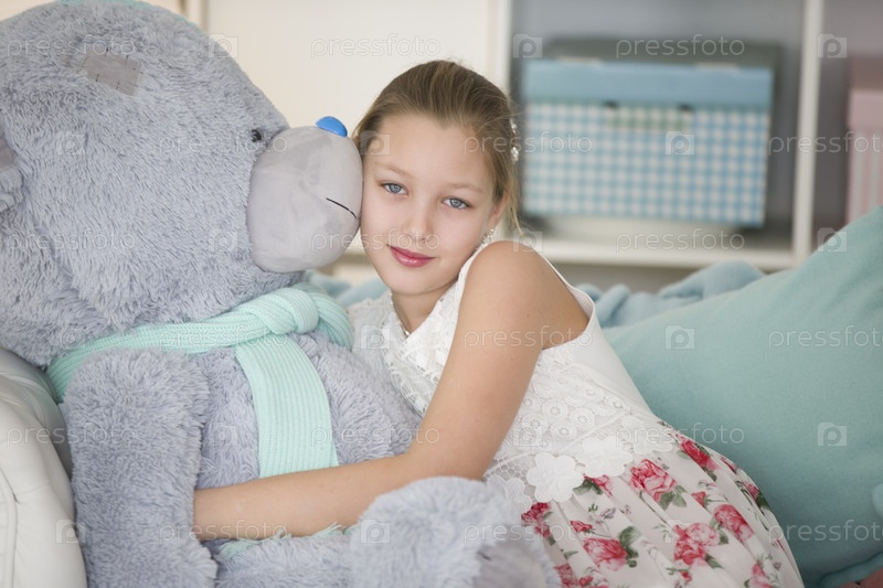 Милая маленькая девочка с огромным плюшевым мишкой. Красивый подросток с мягкой игрушкой