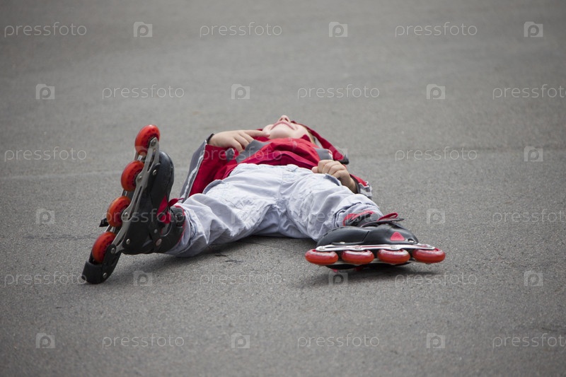 Мальчик на роликовых коньках лежит на тротуаре. Ребенок на роликовых коньках упал