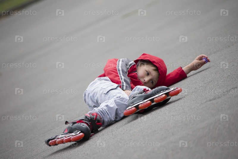 Мальчик на роликовых коньках лежит на тротуаре. Ребенок на роликовых коньках упал