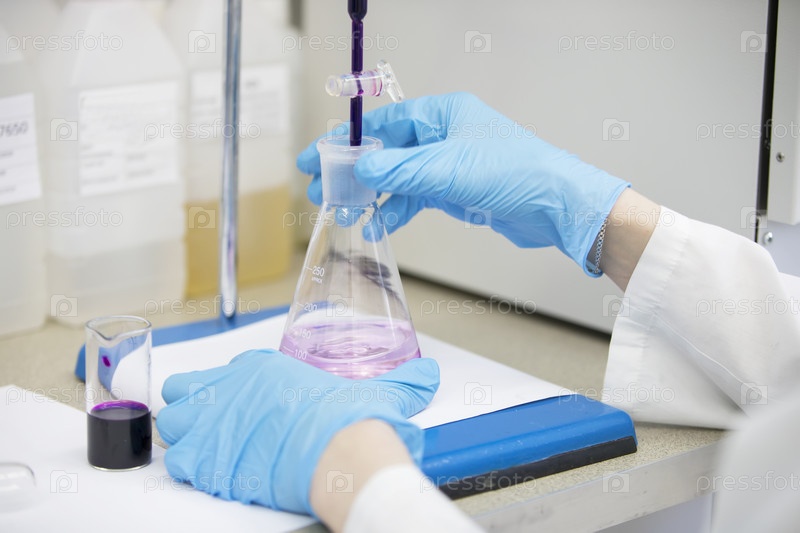 Руки техника в синих резиновых перчатках держат колбу. Фармацевтическая индустрия. Химическая лаборатория