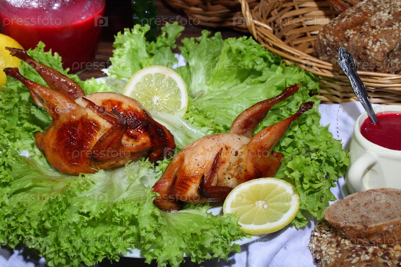 Натюрморт с жареным перепелом, красным вином и клюквенным соусом, лимоном и хлебом на деревянном столе с кувшином