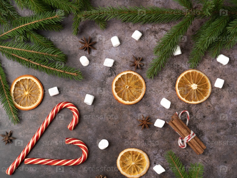Рождественские леденцы с веткой падуба, звездами аниса, палочкой корицы, апельсинами и зефиром. Рождественская композиция