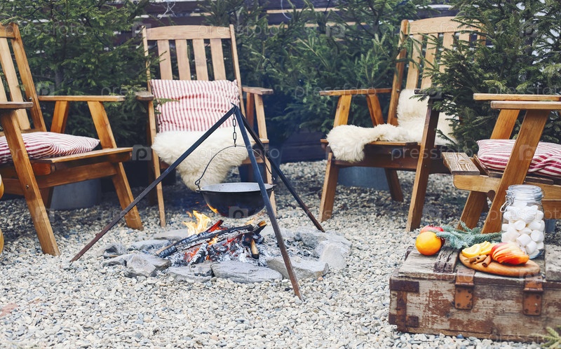 Сверху традиционный глинтвейн с дольками апельсина, приготовленный в горшке над горящими бревнами