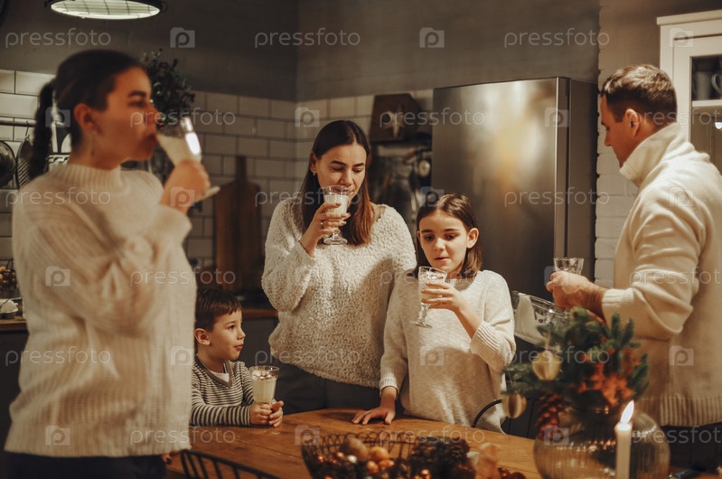 Счастливые радостные семейные родители с двумя детьми наливают домашний гоголь-моголь в стаканы, стоя за деревянным столом