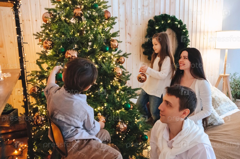 Молодая счастливая европейская семья с двумя детьми вместе украшает рождественскую елку во время зимних каникул