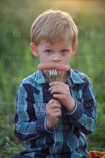 Мальчик на пикнике ест сосиску