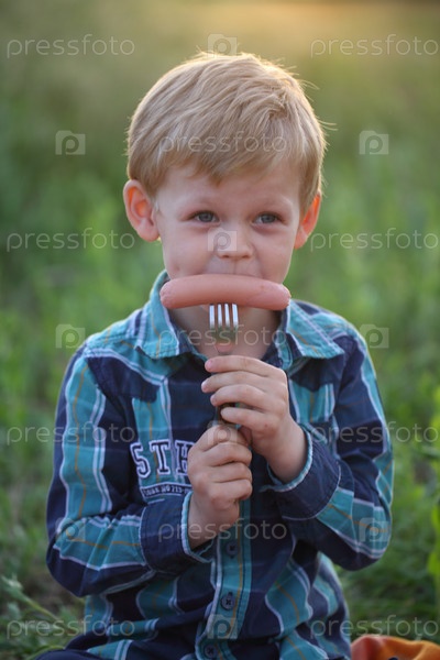Мальчик на пикнике ест сосиску