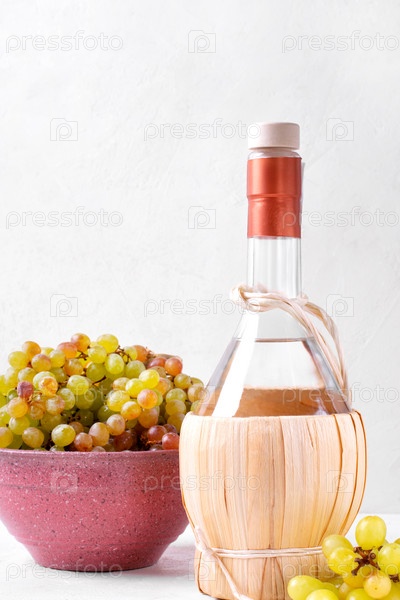 Граппа в стеклянной бутылке и чаше из винограда. Крепкий итальянский алкогольный напиток на белом