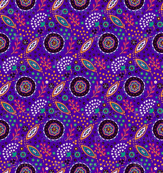 Бесшовный узор с фантазийными цветами, этнический вращающийся повторяющийся дизайн ткани и плитки, натуральные обои, иллюстрация завитка цветочного декора. Пейсли печатает рисованные элементы. Домашний декор