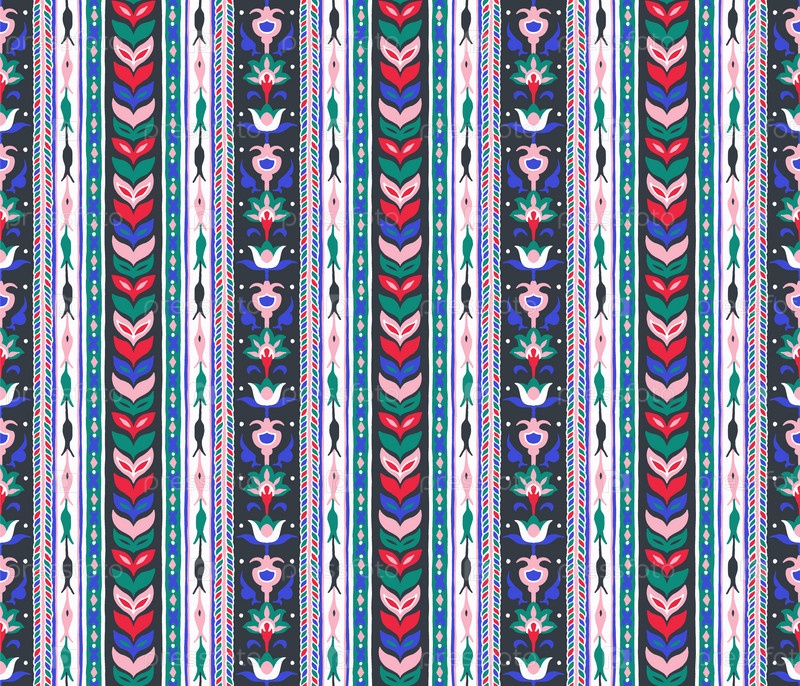 Геометрический дамасский орнамент. Икат границы. Этническая вышивка с листьями и монограммами. Племенная векторная текстура. Бесшовный народный узор в ацтекском стиле. Индийский, скандинавский, цыганский, мексиканский, африканский ковер