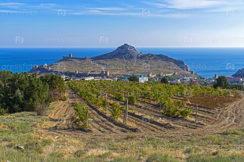 Вид от виноградников у подножия горы Перчем в сторону моря. Судак, Крым. Солнечный день в октябре