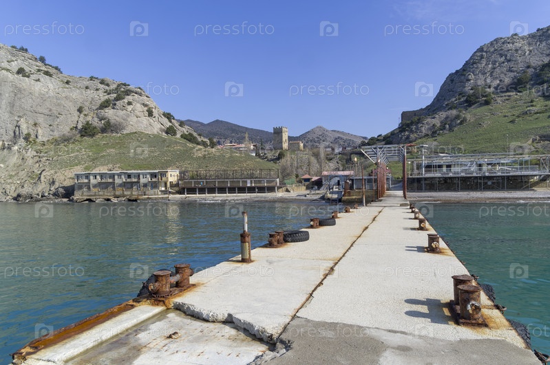 Вид с причала на небольшую бухту. Курортный город Судак, Крым. Не сезон, конец апреля