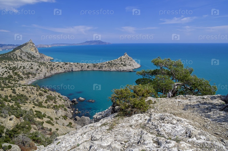 Красивый моморской пейзаж. Вид на Новосветские мысы Капчик и Орел с прибрежной скалы. Крым, солнечный день в конце апреля
