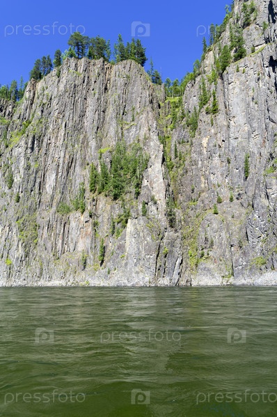Высокий отвесный скальный берег реки Ока Саянская. Иркутская область, Сибирь, Россия. Солнечный день в августе