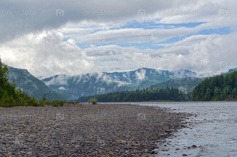 Облака над долиной реки Ока Саянская. Иркутская область, Сибирь, Россия. Август
