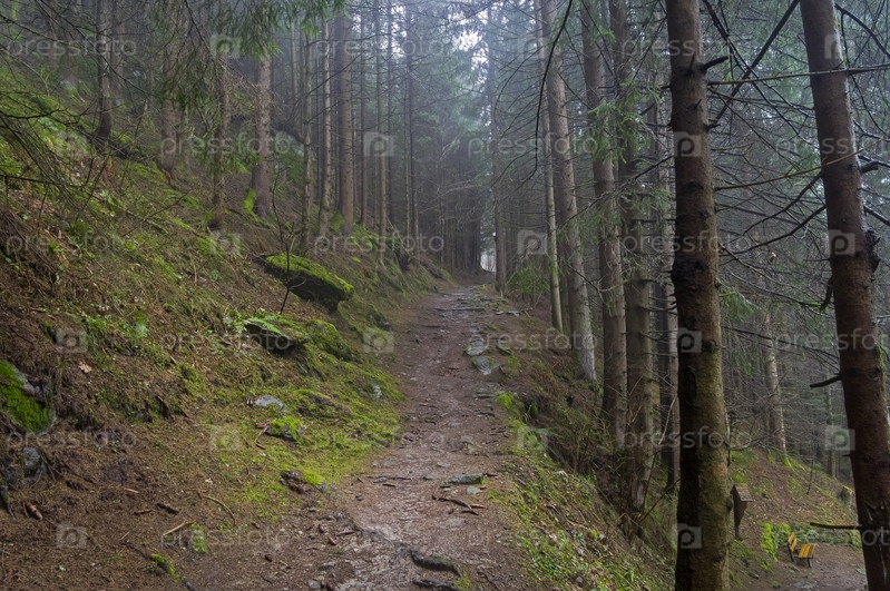 Тропа на горном склоне в тумане. Австрийские Альпы, Тироль, окрестности горнолыжного курорта Майрхофен