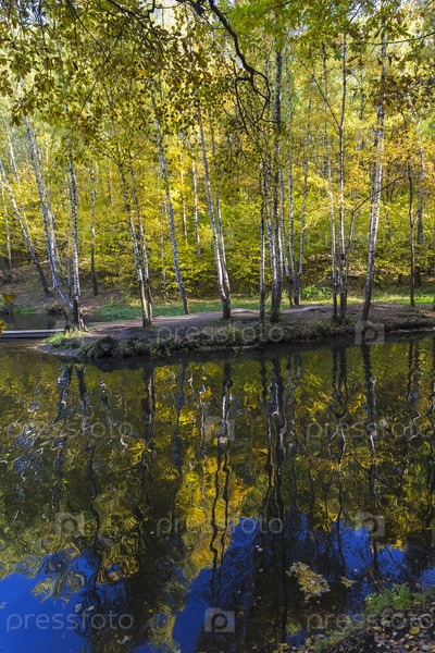 Отражение прибрежных деревьев в водной поверхности. Пруд в ландшафтном заказнике Теплый Стан, Москва, Россия. Солнечный день в октябре