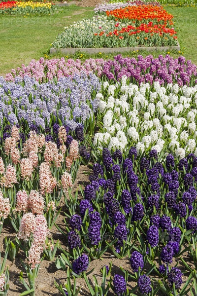 Красивые разноцветные гиацинты под ярким весенним солнцем
