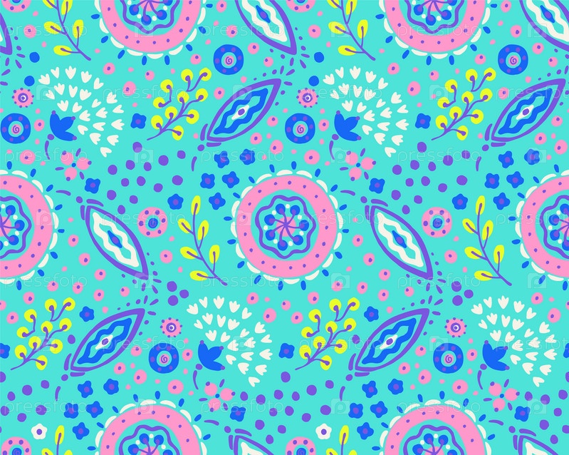 Бесшовный узор с фантазийными цветами, этнический вращающийся повторяющийся дизайн ткани и плитки, натуральные обои, иллюстрация завитка цветочного декора. Пейсли печатает рисованные элементы. Домашний декор