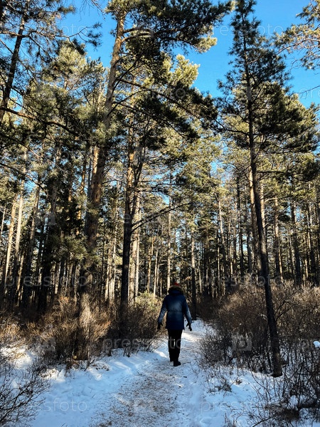 Путешественник в синей зимней куртке с красной кепкой в лесу. Песчаная бухта, озеро Байкал