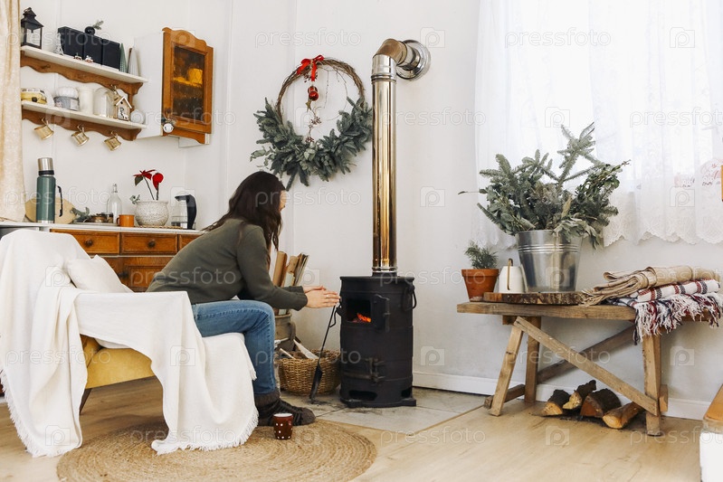 Фото сзади женщины, сидящей у буржуйки дома, греющей руки женщины