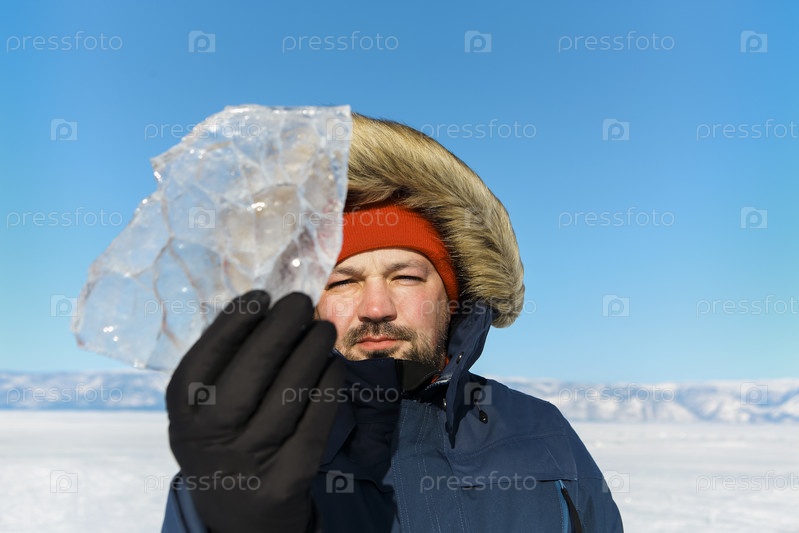 Счастливый улыбающийся мужчина в зимней синей куртке и красной шапке держит кусок прозрачного колотого льда