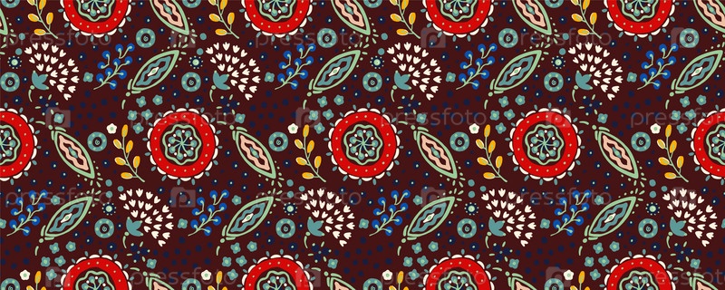 Бесшовный узор с фантазийными цветами, этнический вращающийся повторяющийся дизайн ткани и плитки, натуральные обои, иллюстрация завитка цветочного декора. Пейсли печатает рисованные элементы. Домашний декор