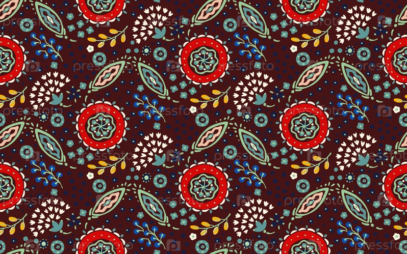 Бесшовный узор с фантазийными цветами, этнический вращающийся повторяющийся дизайн ткани и плитки, натуральные обои, иллюстрация завитка цветочного декора. Пейсли печатает рисованные элементы. Домашний декор