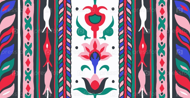 Геометрический дамасский орнамент. Икат границы. Этническая вышивка с листьями и монограммами. Племенная векторная текстура. Бесшовный народный узор в ацтекском стиле. Индийский, скандинавский, цыганский, мексиканский, африканский ковер